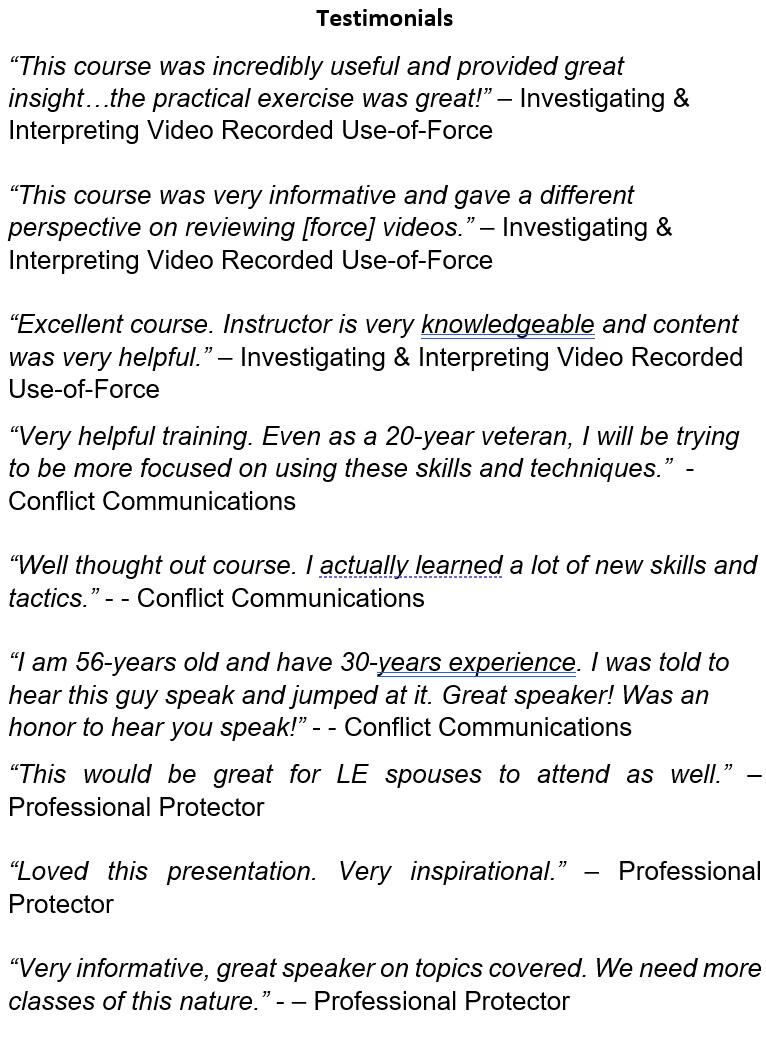 This course examines the relationship of law enforcement officer mindset, training, tactics, and experience, and the impact upon their conflict communications skills. Supported by contemporary human factors research, attendees will acquire advanced knowledge to enhance their conflict and cross-cultural communications skills, which can increase officer safety, improve police-community interactions, and promote de-escalation. This course is more than a “communications skills” course and examines communications from a visual, verbal, mental, and tactical perspective.Conflict Communications (For Private Sector Protectors)